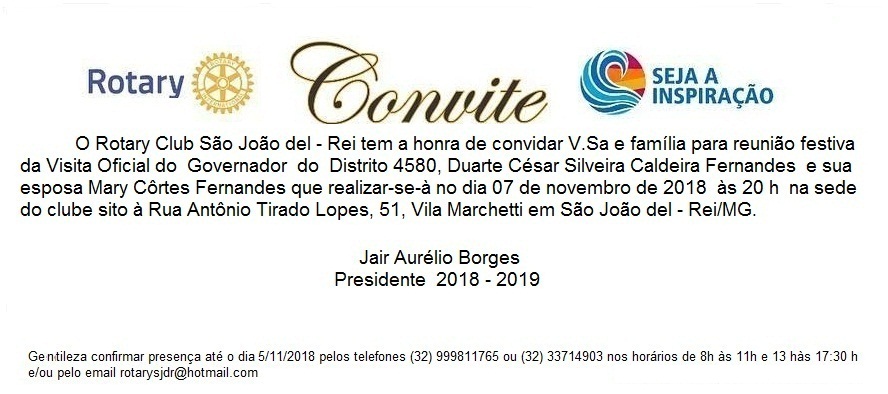 O Rotary Club São João del - Rei terá a honra de receber visita ofical do Governador do Distrito 4580 de RI, bem como de sua esposa, Tânia quando estará completando seu cinquentenário de fundação em 07/11/2016.